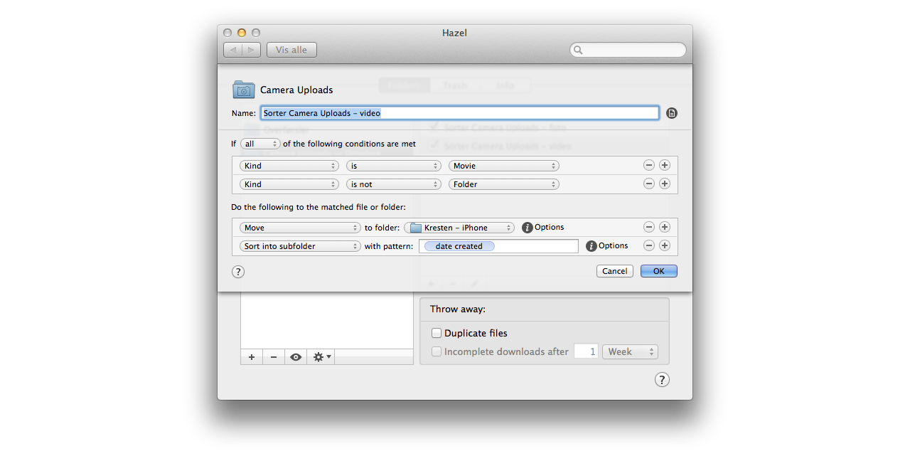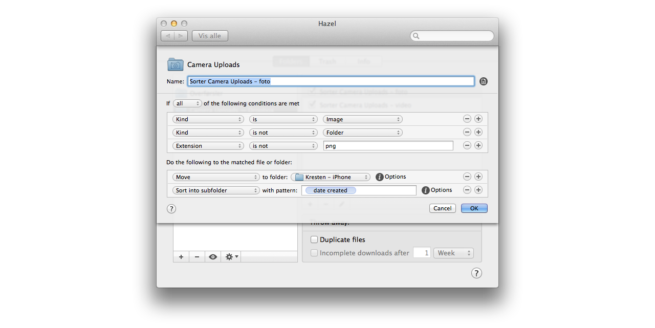 Herefter skal du over på din Mac. På Mac'en åbnes Hazel fra "Instillinger" og mappen "Camera Uploads" tilføjes til i dine overvågende mapper. I den mappe skal der køre to regler; én til billeder og én til videoer.
